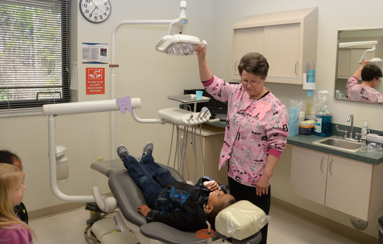 In the above image by Verda Parker, Lynn McDonald, registered dental hygienist at the Naval Branch Medical Clinic’s Dental facility, gives a visiting student a ride in the dental chair.