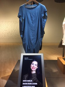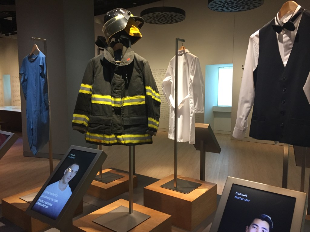 Next to the introductory panel are six uniforms representing six different vocations: a firefighter’s uniform, a pastor’s Geneva gown, a waiter’s jacket-less tux, a doctor’s white lab coat, a dark, pinstriped banker’s suit with red tie, and a dress crafted by a fashion designer. Just in front of each vocational costume is a flat screen panel ; a touch of the screen, and the person on the screen begins to tell their story, their story of how their faith gleaned from the Bible supports their work.