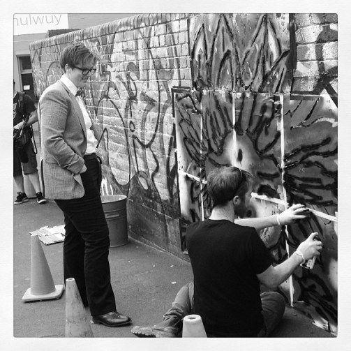 Hannah Gadsby with Jason Wing, an Aborigine artist, talking about his art for a documentary.