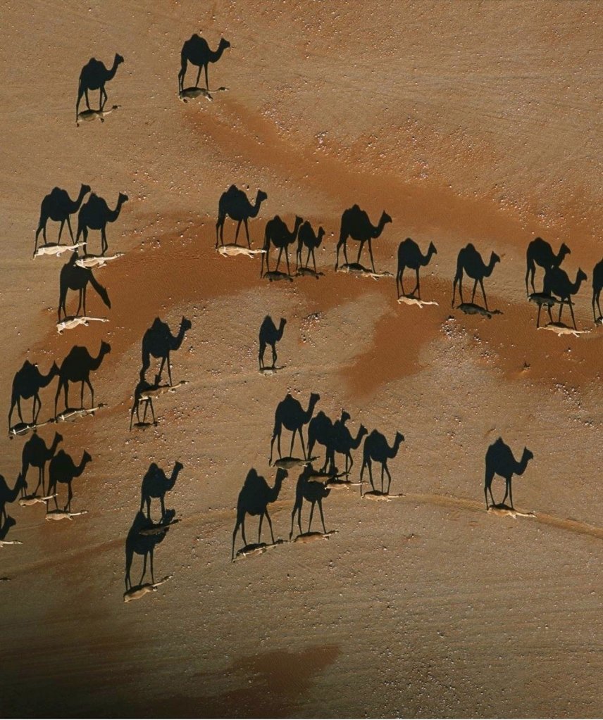 Years ago I came across this photo of camels in the desert. If you look quickly, it seems clear that the camels are the large shapes in the sand.