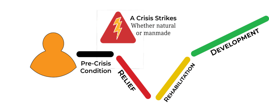 - Relief can be defined as the urgent and temporary provision of emergency aid to reduce suffering from a natural or man-made crisis. After a crisis, relief attempts to halt the freefall and to “stop the bleeding.” The key feature of this category is a provider-receiver dynamic with given assistance and given material. The individual or community in crisis is typically asked to contribute little or nothing toward the reduction of suffering.